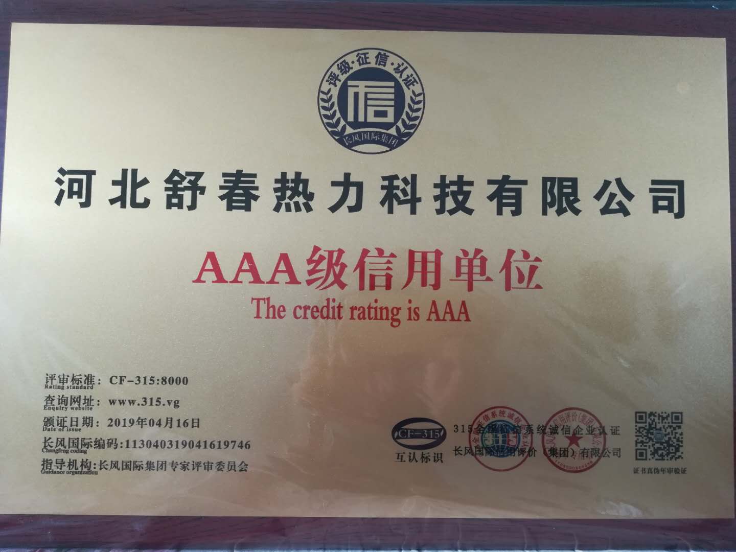 AAA級信用單位,舒春真誠對待每一個人 2019年4月16日,河北舒春熱力科技有限公司取得了AAA級信用單位、誠信經(jīng)理人、誠信企業(yè)家、AAA級質(zhì)量服務信譽單位、 AAA級重合同守信用單位、AAA級誠信經(jīng)營示范單位、AAA級資信等級、AAA級信用等級。 |